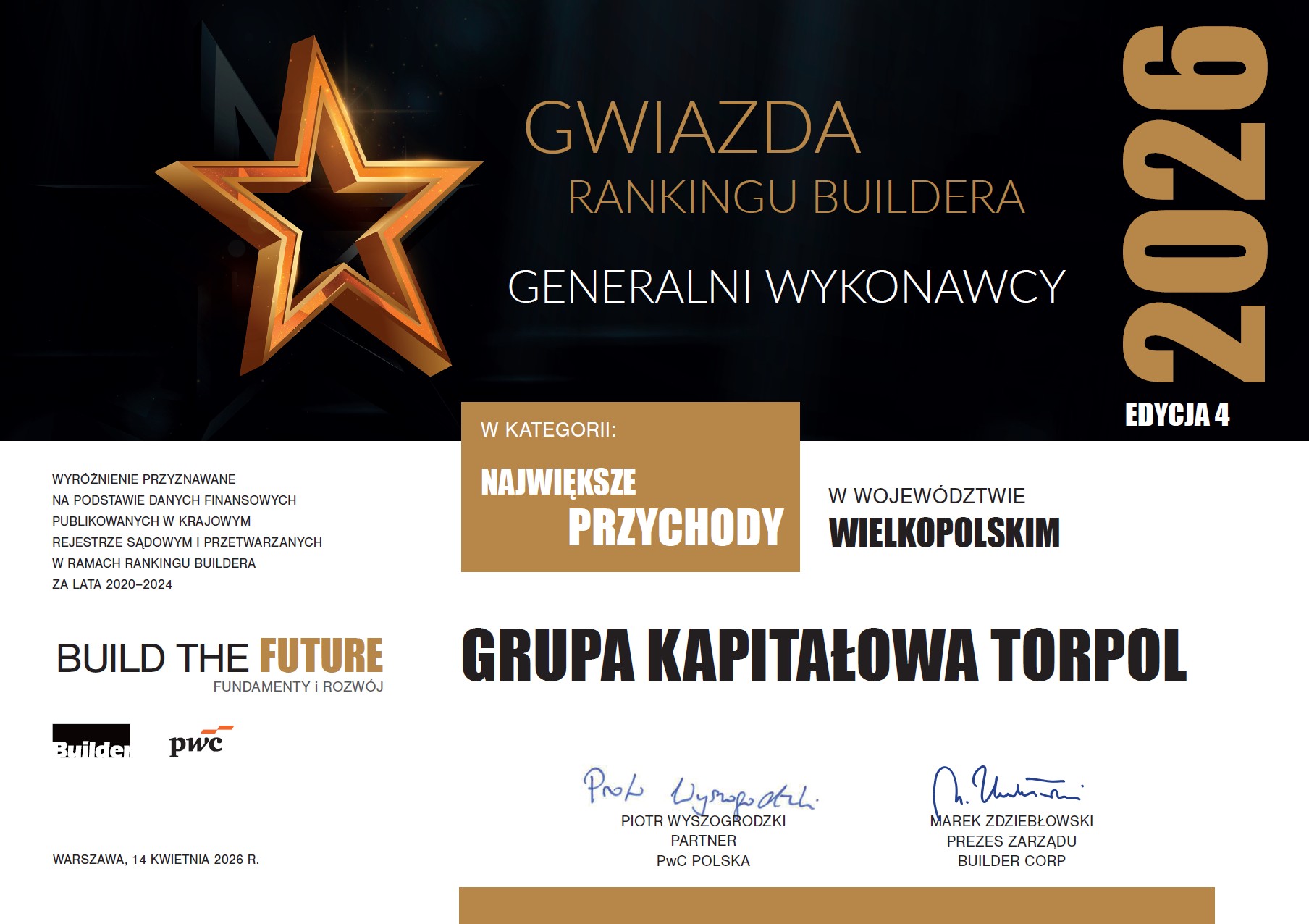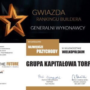 Grupa Kapitałowa Torpol została uhonorowana prestiżowym tytułem „Gwiazdy Rankingu Buildera 2026”, przyznawanym przez redakcję miesięcznika „Builder” oraz PwC Polska. Wyróżnienie trafiło do spółki w kategorii firm osiągających najwyższe przychody w województwie wielkopolskim i stanowi efekt analizy wyników finansowych z lat 2020–2024.